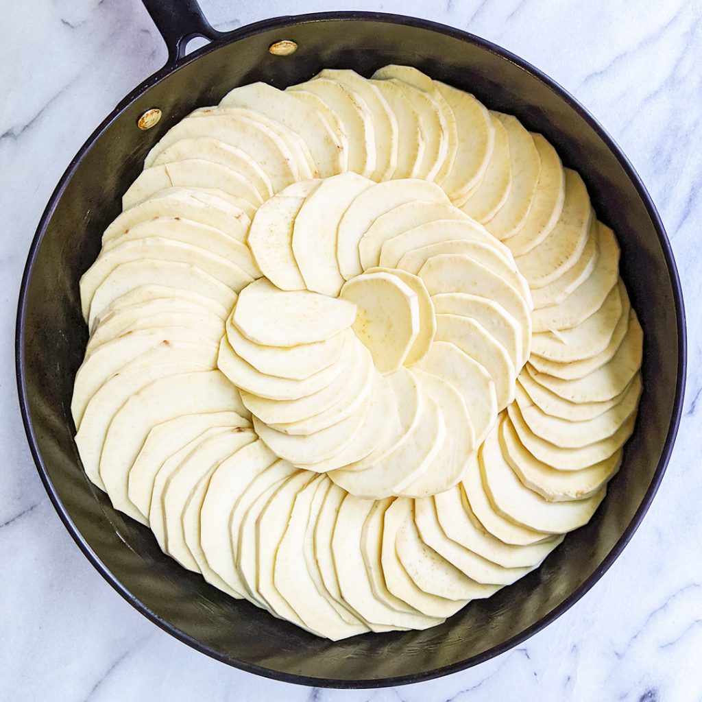 - I selected a 9-inch round pan for this recipe but you can use a square or rectangular pan if you prefer. Just stack the sweet potato slices on top of each other either in a circular pattern if using a round pan or into rows if using a square/rectangular pan.