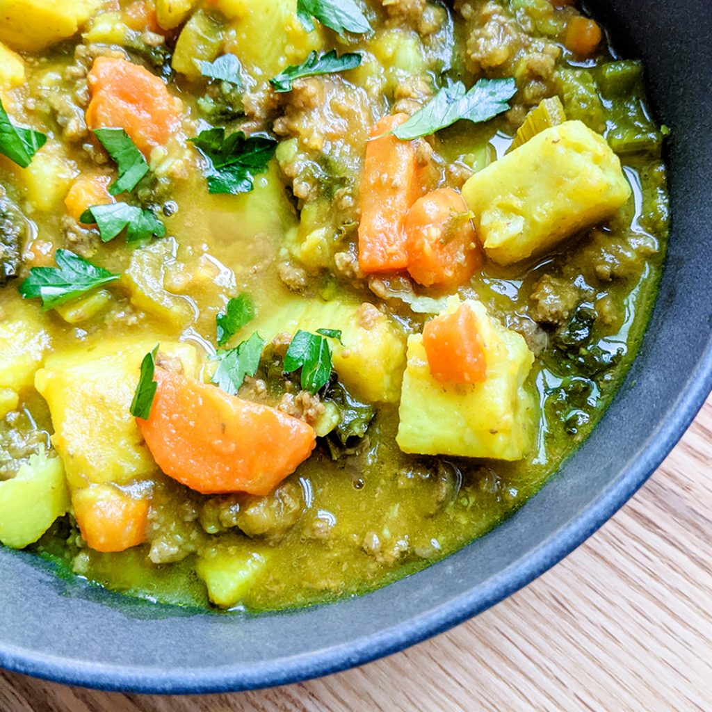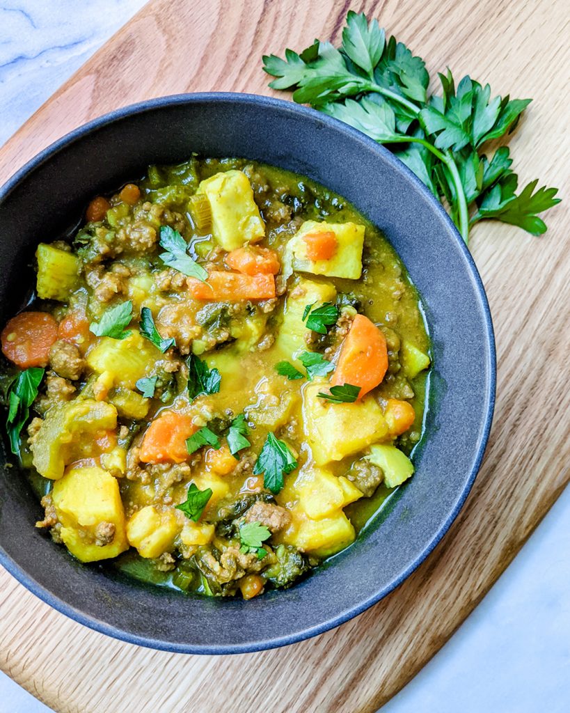 Warm, filling, and nourishing, this AIP/Paleo and low-FODMAP Ground Bison and Vegetable Stew is perfect for cold winter days. This hearty and flavorful stew is one of my family’s favorite meals and the bison . The white sweet potatoes, carrots, kale, and pureed butternut squash are such a great complement to the ground bison.