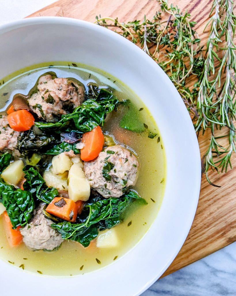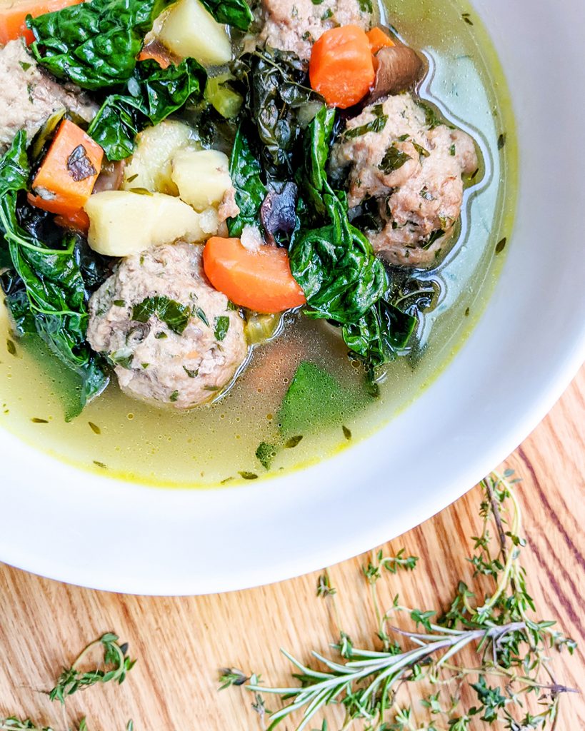If you are following the elimination phase of AIP or are sensitive to nightshades, parsnips are a wonderful addition to soups in place of potatoes. Parsnips have a creamy texture which really complements the Tuscan kale, mushrooms, and herbs in this comforting winter soup. The addition of turkey and parsley meatballs makes for an easy and filling protein.